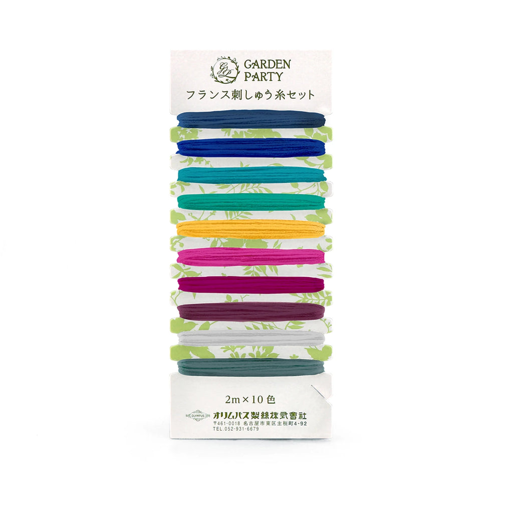 Includes 10 colors of Garden Party themed, assorted Olympus Cotton Embroidery floss No 25. Each color is 2-1/5 yards and separately wound on the same cardboard spool. These embroidery threads are glossy and beautiful, and colors do not fade.