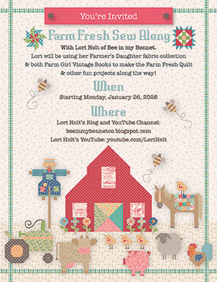 Reserve your Farm Fresh Sew Along Fabric Kit now! Join Lori Holt on her blog and/or YouTube channel starting Monday, January 26, 2026 to learn how to make the adorable blocks in her new sew along program. The program is free(!) but you'll need this kit featuring fabric from her newest collection - Farmer's Daughter. The Farm Fresh Quilt finishes at 88-1/2" x 95-1/2". You will also need two books for the block patterns: Farm Girl Vintage and Farm Girl Vintage 2 (sold separately).