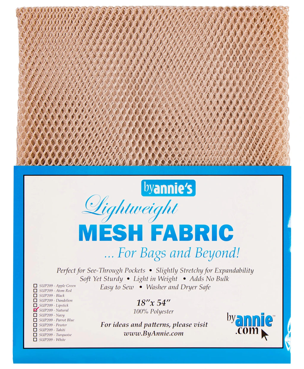 Lightweight and a bit stretchy, this mesh is fabulous! Perfect for pockets on bags or anywhere you want to be able to see what you are storing, the mesh also works great in various garment applications and utility needs. To help you sew, the mesh is specially coated to be less slippery and easy to work with, while still being soft and pliable.