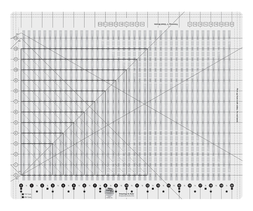 The Stripology® XL Ruler designed by Gudrun Erla for Creative Grids® is a multipurpose tool for cutting strips, squares, rectangles, diamonds, and triangles. It can also reduce your cutting time by 75 percent.