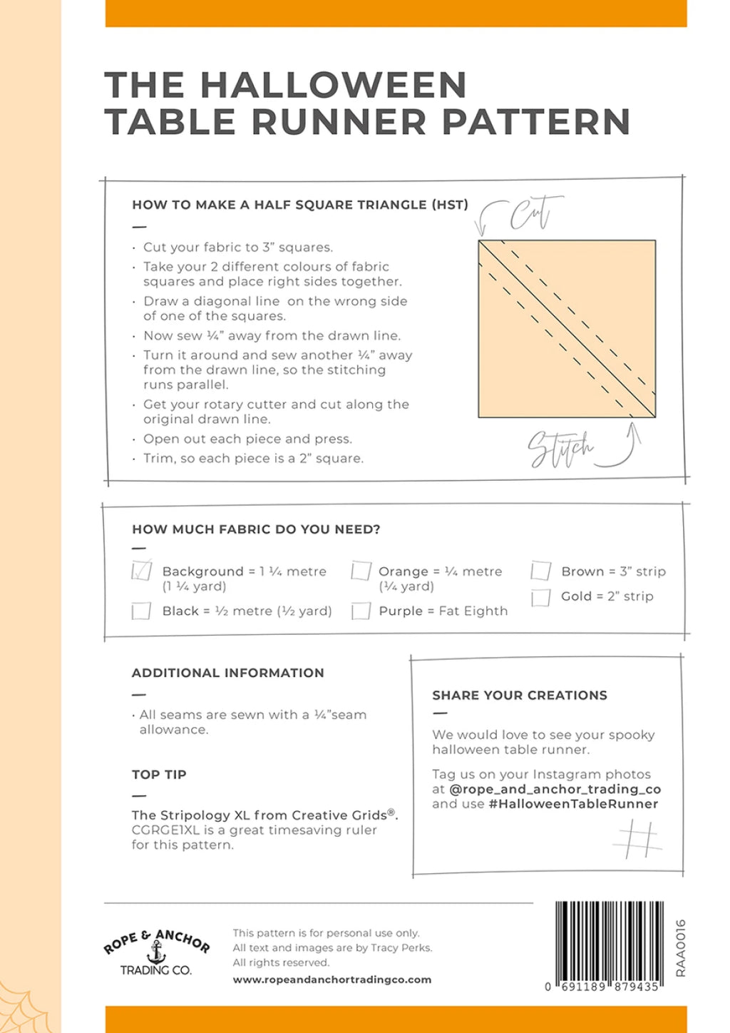 Create a spectacular center piece to your Halloween home decor this spooky season with our 73.5” x 13.5” inch table runner. This easy to follow pattern has no tricks, and is a treat for any beginner that wants a creative project this Halloween.