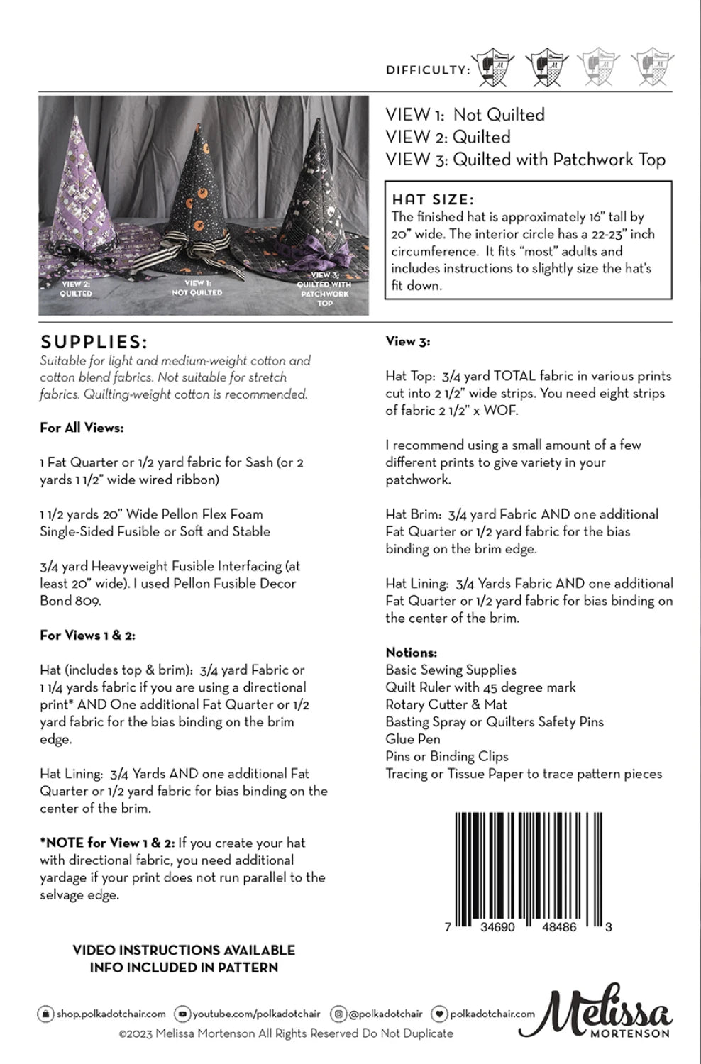 The Spellbound Witch Hat Sewing pattern is a pattern for a quilted, lined, wearable Witch's Hat with an optional sash. The Spellbound Witch's Hat pattern features three different versions (all included with the pattern): Patchwork Quilted Hat, Quilted Hat, and Non-Quilted, Non Patchwork Hat
